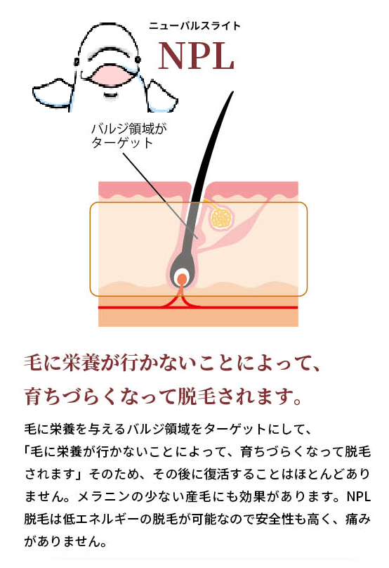 NPL方式で施術することにより、 施術後に毛が抜け落ちるイメージでは無く、毛が生えずらく細くなり徐々に毛量が減っていきます。 脱毛期間中にシェーバーによる毛の処理が可能です(毛抜きは厳禁です) |