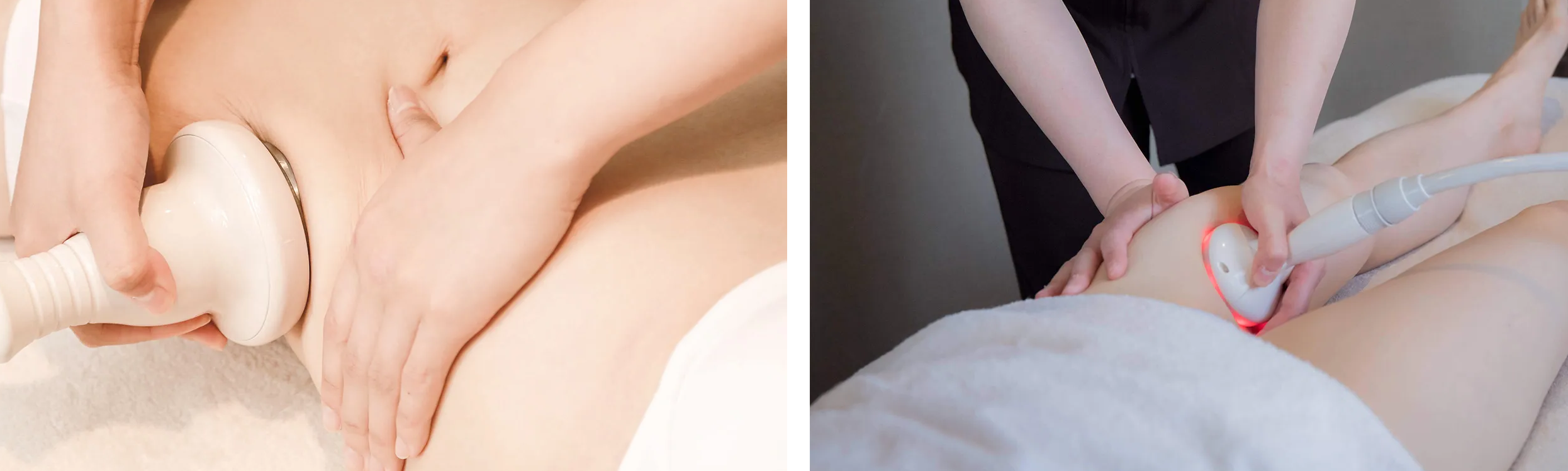 固くなりセルライト化した脂肪を、キャビテーション&ラジオ波と吸引・ハンドリンパの組み合わせで、分解して柔らかくします。1回の施術で変化を実感される方が多いトリートメントです
